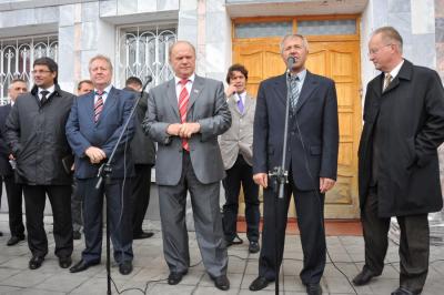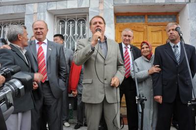 Затем на площади перед Домом культуры состоялся митинг. Его открыл первый секретарь Азовского райкома КПРФ В.Ф. Шоль. Он предоставил слово для выступления Геннадию Андреевичу Зюганову.