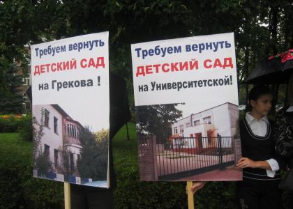 В руках его участников опять были плакаты с фотографиями разрушенных или «прихватизированных» за годы «рыночной экономики» зданий и требованиями вернуть их детям. Но список упомянутых при этом улиц региональной столицы, где некогда находились ясли, сады и начальные школы, по сравнению с первой акцией оказался заметно длиннее. К улицам Киевской, Добролюбова, Челнокова, Университетской, Чайковского прибавились улицы Грекова, Брамса, Красносельская, а также проспект Победы. И, очевидно, что печальный перечень будет продолжен - ведь число потерянных образовательных учрежжений оценивается, по меньшей мере, в четыре десятка.