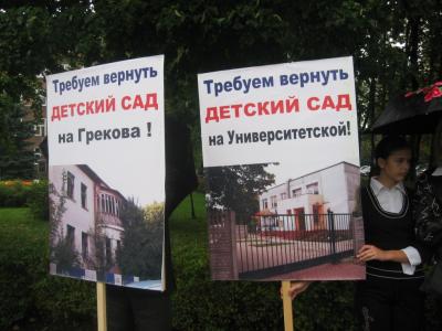 В руках его участников опять были плакаты с фотографиями разрушенных или «прихватизированных» за годы «рыночной экономики» зданий и требованиями вернуть их детям. Но список упомянутых при этом улиц региональной столицы, где некогда находились ясли, сады и начальные школы, по сравнению с первой акцией оказался заметно длиннее. К улицам Киевской, Добролюбова, Челнокова, Университетской, Чайковского прибавились улицы Грекова, Брамса, Красносельская, а также проспект Победы. И, очевидно, что печальный перечень будет продолжен - ведь число потерянных образовательных учрежжений оценивается, по меньшей мере, в четыре десятка.