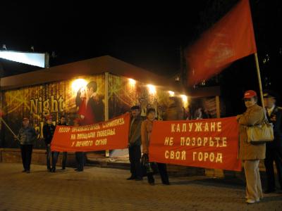 Коммунисты города Калуги, участники Великой Отечественной войны, труженики тыла, узники фашистских концлагерей, комсомольцы и сторонники КПРФ 25 сентября провели пикет против организации конкурса стриптиза на Площади Победы у Вечного Огня.