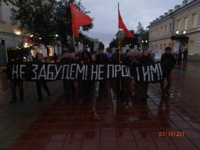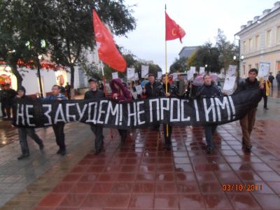 По окончанию мероприятия, активисты выстроились в колонну и провели по улице Советской траурное шествие. Комсомольцы держали в руках транспарант "Не забудем! Не простим!". Также у каждого участника шествия были свечки в память о сотнях погибших в те трагические дни и портреты жертв «черного октября». Всю дорогу скандировались лозунги: "Помним, чтим... Не забудем, не простим!", "Слава героям 93-го!", «Нет прощения палачу Ельцину!» и другие.