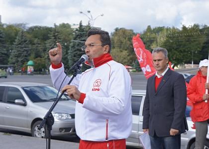- Сегодня мы собрались на Театральной площади, чтобы почтить память тех защитников Верховного Совета, которые погибли, защищая Советскую власть, – открыл митинг секретарь Ростовского обкома КПРФ, депутат Законодательного Собрания Евгений Бессонов. - Пришли к власти негодяи, которые терзают и мучают нашу страну, которые «подарили» пенсионный закон, узаконивший пенсию ниже прожиточного минимума, Трудовой кодекс, который узаконил зарплату ниже прожиточного минимума, Земельный кодекс, который разрешил продажу нашей священной русской земли. Нам навязывают культ «золотого тельца», идеалы «Содома и Гоморры». Навязывают «своих»: вы знаете московского губернатора, который поволок за собой москвичей, ничуть не связанных с проблемами жителей Ростовской области. Что мы получаем? А то, что из областного бюджета, сформированного из наших с вами денег, губернатор отдает 76 млн. рублей московскому олигарху на так называемую «русскую свинину». Название слышите? Когда немецкие оккупанты были на нашей земле, они говорили: «Russischschwein!», и такое же название. Они издеваются над нами. Пришли оккупанты, которые уничтожают по миллиону в год граждан России, на 13 тысяч за 9 месяцев уменьшилось население Ростовской области, и это благодаря тем законам, которые протаскивает теперь уже Правительство Ростовской области.