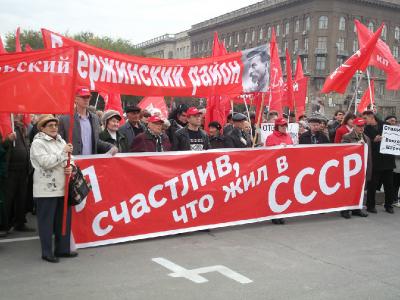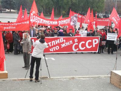 Еще одним характерным моментом мероприятия было большое количество плакатов, пропагандирующих Советскую власть и советский период в истории, среди них выделялся большой баннер коммунистов из Волжского – «Я счастлив, что жил в СССР».