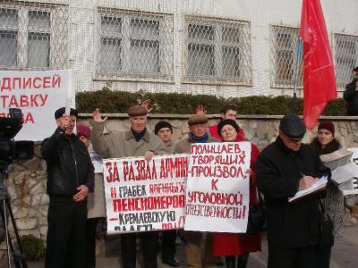 В тот раз только что прошедшие переаттестацию сотрудники полиции незаконно задержали участников пикета и изъяли у них плакаты и официально издающиеся газеты «Левый марш» и «Губернский вестник». 16 пикетчиков были доставлены в здание УВД по городу Ульяновску, где их продержали без пищи и воды несколько часов. Затем, без предъявления каких-либо обвинений задержанные были отпущены. Исключение было сделано только для подписавшего уведомление о проведении пикета Владимира Аладина, на которого было составлено сразу два протокола – якобы за хулиганские действия и проведение незаконного пикета. Этого 65-летнего человека, страдающего диабетом и гипертонией, новоявленные «Пришибеевы», несмотря на необходимость госпитализации в связи с резким скачком давления, отказались передать бригаде скорой помощи.