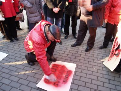 В результате длительных переговоров полиции пришлось уехать ни с чем – ни одного коммуниста им задержать не удалось. Однако традиционную гадость «стражи порядка» все же успели совершить – сломать новые агитационные трафареты Компартии.