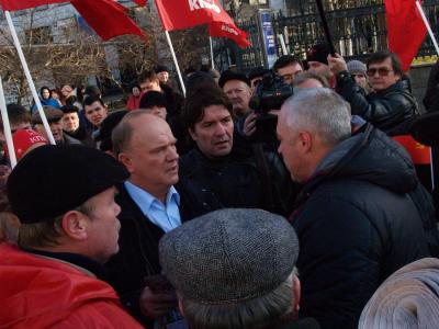 Главный «полисмен», одетый в штатское и не пожелавший представится, начал обвинять Г.А. Зюганова и В.Ф. Рашкина в организации несанкционированного митинга. Одновременно сотрудники полиции, вооруженные автоматами, попытались хватать депутатов-коммунистов за руки и недвусмысленным образом «приглашать» в свои автомобили. Геннадий Андреевич и Валерий Федорович популярно объяснили представителям власти, что Компартия ничем незаконным не занимается, а такие мероприятия – неотъемлемая часть избирательной кампании, которую они, зарегистрированные кандидаты в депутаты Государственной Думы, проводят. Народные избранники подчеркнули, что «Молодой гвардии» почему-то можно спокойно раздавать свои листовки, а коммунистам это запрещают.