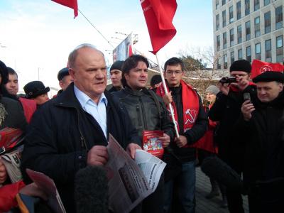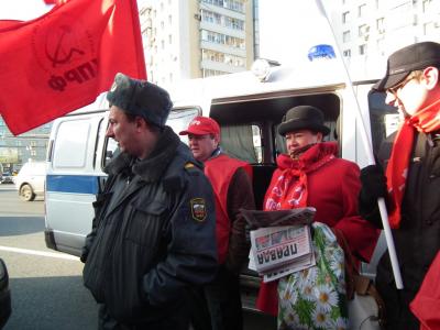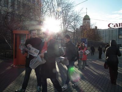 Резкое похолодание в Москве не охладило пыла агитторов-коммунистов в их беседах с москвичами. Видимо, поэтому реакция из здания напротив места проведения акции - там располагается МВД - последовала незамедлительно. Старший сержант полиции Подкатнов по приказу своего так и не представившегося начальника в штатском (тот сообщил о себе только то, что явяется командиром роты - ни должности, ни звания, ни имени с фамилией у полицейского начальства, по видимому, не имеется) пытался задержать активиста компартии безо всяких законных оснований. Однако - не на тех напали! Попытки полицейских были отбиты, кадидаты дали интервью собравшимся журналистам российских телеканалов и с честью закончили акцию.
