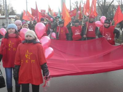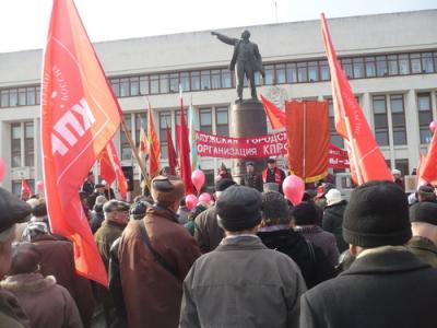 Однако все по порядку. Накануне, вдруг выяснилось, что Городская управа не разрешает калужским коммунистам проводить митинг на пл. Ленина, а предлагает провести его в заброшенном сквере Волкова, который находится «у черта на куличках» и больше известен калужанам, как место для выгула собак и помойки. Коммунисты вынуждены были подать повторно заявку о том, что митинг ими запланировано провести на пл. Ленина, что и было осуществлено на практике. В 10.20 большая колонна калужан с транспарантами, красными стягами и под аккомпанемент духового оркестра, возглавляемая коммунистами и их союзниками, выдвинулась от места сбора – площади Победы по центральной ул. Кирова, далее по ул. Ленина до пл. Победы. Сопровождали праздничную колонну демонстрантов несколько автомобилей ГИБДД и большое количество работников городской полиции общественного порядка, от которых «рябило в глазах». Тем не менее, каких-либо конфликтов между правоохранительными органами и участниками мирной демонстрации не произошло.
