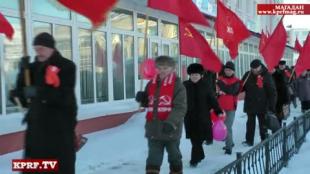 В понедельник, 7 ноября, коммунисты города собрались на площади Комсомольской, у телевышки. Из динамиков машины сопровождения звучало приглашение в колонну демонстрантов и на митинг и революционные песни. В 12 часов колонна двинулась по улице. Возглавлял шествие знаменосец, Есипенко Александр Григорьевич, со знаменем городского комитета. Колонна, расцвеченная красными флагами, бантами на лацканах, шарами и алыми гвоздиками шла к площади Космонавтов к памятнику В.И. Ленина.
