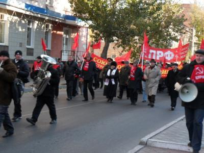 Коммунисты под красными флагами, скандируя лозунги коммунистического и оппозиционного содержания, с оркестром прошли по главным улицам города. Во главе колонны шли конные наездницы в буденовках и с флагами КПРФ и СССР.