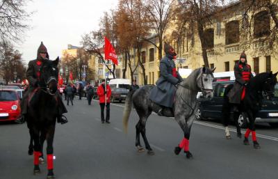 7 ноября более 2, 5 тысячи курян приняли участие в праздничной демонстрации и митинге в честь 94-й годовщины Великой Октябрьской социалистической революции. Колонну открывали конармейцы, одетые в шинели и буденовки. Затем шли знаменосцы. В основном это молодые коммунисты и комсомольцы. Но не отставали от них сотни ветеранов труда, партии и войны. Среди них - генерал-майор в отставке, Почетный гражданин Курской области, а также городов Курска и Винева Тульской области, еще многих городов страны, коммунист Михаил Васильевич Овсянников. Утром он смотрел военный Парад 1941 года. 70 лет назад он был его участником и прямо с Красной площади столицы отправился на фронт. В составе 328-го стрелковой дивизии участвовал в битве за Москву, освобождал Ригу, Прагу, дошел до Берлина, война закончилась для него 16 мая в Чехословакии. А потом еще 49 лет служил в Армии. Награжден двумя орденами Красного Знамени, четырьмя орденами Красной Звезды, двумя орденами Отечественной войны 1 и 2-й степени, медалью «За боевые заслуги» и многими другими.