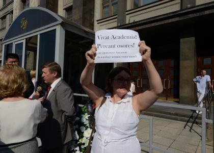 "Похороны" Академии наук прошли 5 июля у ворот Госдумы. Пикетчики из разных институтов Академии наук установили у входа в парламент гробовую доску с датами основания Академии Петром Великим и "убийства" ее правительством Путина-Медведева.