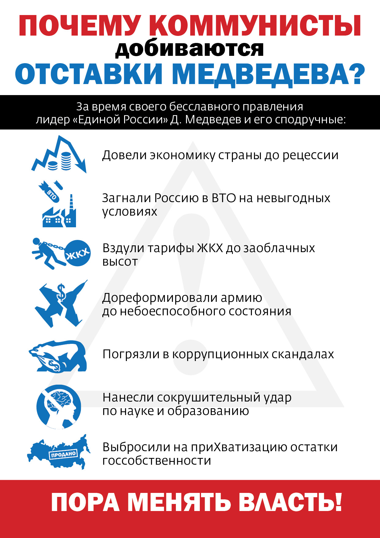 Подробно ознакомиться с обращением более 100 депутатов Госдумы с 10 претензиями к правительству Медведева можно ознакомиться по ссылке: Десять причин для отставки правительства. Обращение депутатов Государственной Думы, выступивших с предложением о недоверии правительству Российской Федерации (http://kprf.ru/dep/gosduma/statements/120453.html).