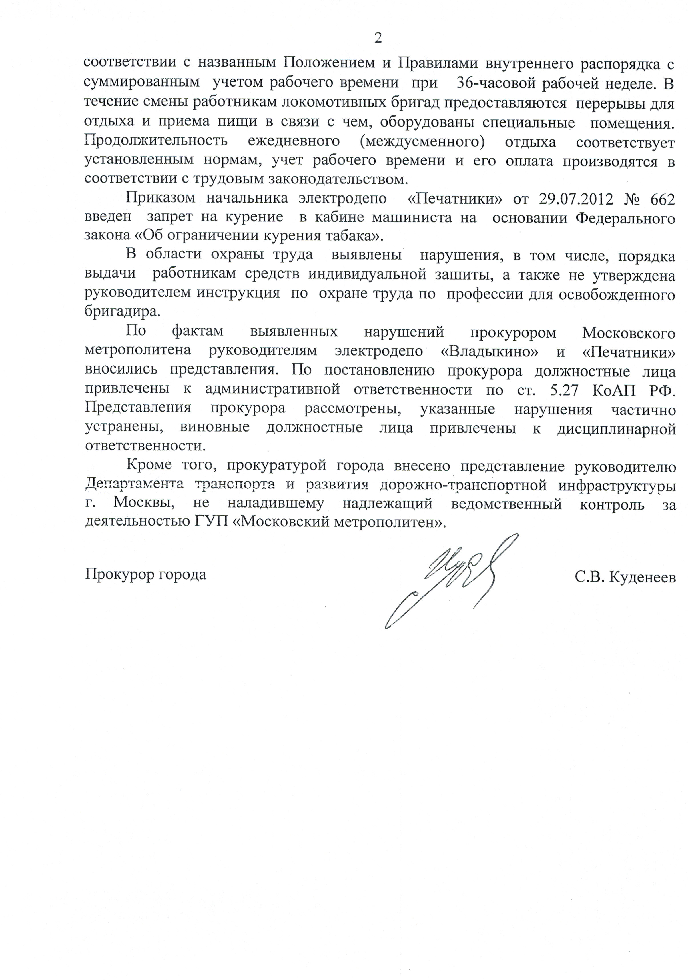 После депутатского запроса первого секретаря МГК КПРФ В.Ф. Рашкина руководителям электродепо «Владыкино» и «Печатники» ГУП «Московский метрополитен» внесены представления об устранении нарушений закона. В отношении должностных лиц электродэпо возбуждены дела об административных правонарушениях.
