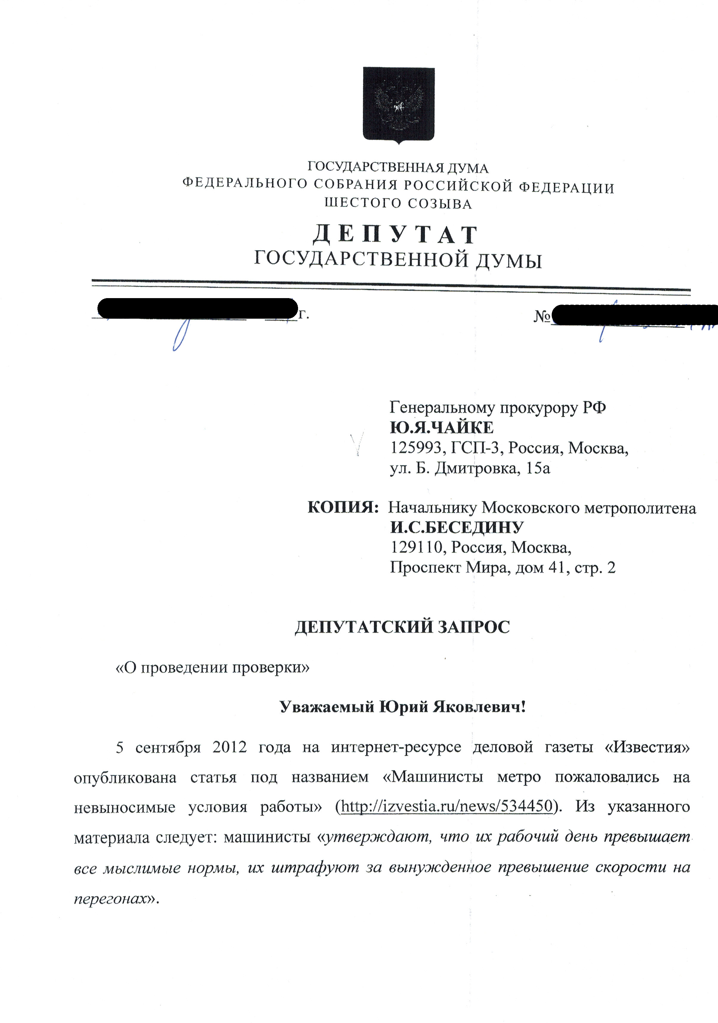 Заместитель Председателя ЦК КПРФ В.Ф. Рашкин направил в Генральную прокуратуру депутатский запрос, в котором указал на нарушения трудовых прав рабочих Московского метро и призвал принять все необходимые меры, чтобы исправить эту ситуацию.