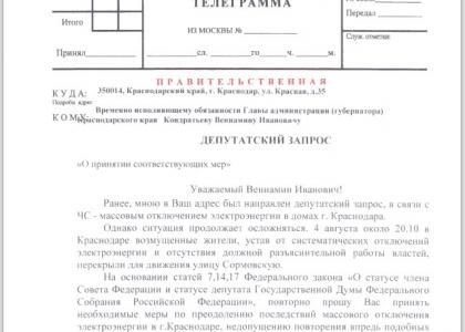 принятии соответствующих мер» врио губернатора Кубани В.И.Кондратьеву и Главе муниципального образования город Краснодар