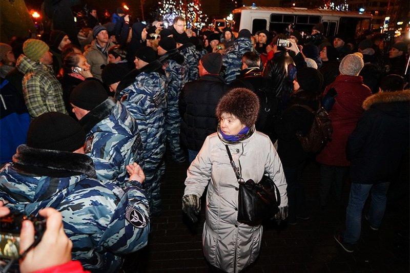 Полиция оцепила сквер между памятником Александру Пушкину и театром «Россия», поэтому протестующим с парламентариями пришлось жаться на тротуаре у выхода из метрополитена.
