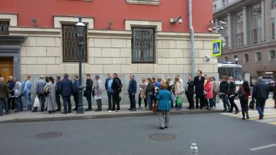 выстроившись в длинную очередь у дверей мэрии, и среди охраняющих вход