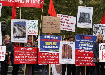 16 сентября в Пушкинском сквере прошёл митинг обманутых дольщиков, собравший более сотни представителей 11 долгостроев Томска. Организаторами акции выступили первый секретарь Томского обкома КПРФ Алексей Фёдоров и инициативная группа обманутых дольщиков во главе с активисткой Ириной Крайсман.