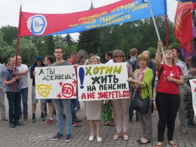 9 июня в Первомайском сквере по инициативе Федерации профсоюзов Новосибирской области прошел пикет против повышения пенсионного возраста. Основные участники пикета – молодежь из различных профсоюзных организаций нашего города: