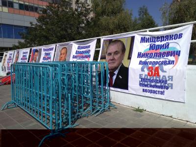 На площадке проведения митинга коммунисты разместили плакаты с портретами представителей Оренбургской области в Госдуме с комментариями, что они поддержали этот антинародный законопроект. Но часть плакатов еще до начала акции служители закона прикрыли ограждающими решетками. На этот факт во вступительной речи обратил внимание оренбуржцев ведущий митинга - коммунист-депутат Горсовета Денис Батурин. Эти заграждения не остановили возмущенных горожан и во время митинга на портретах появились надписи маркером «предатель», «иуда» и подобные.