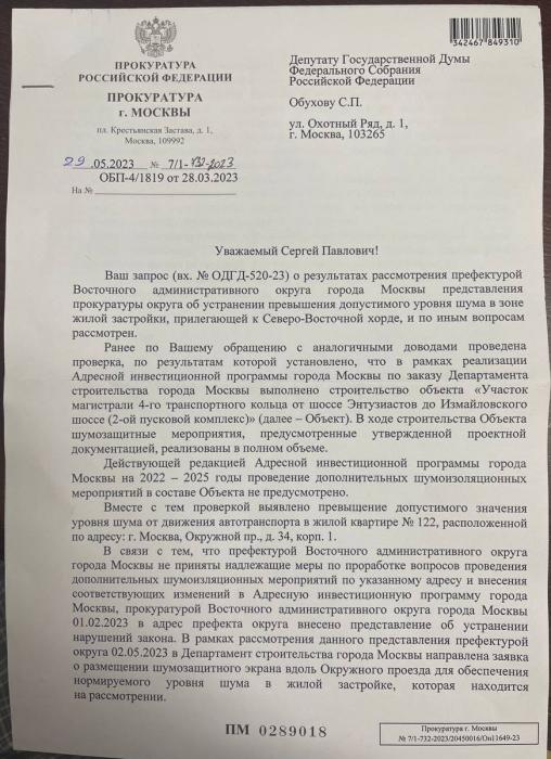 Как сообщила прокуратура города Москвы в своем ответе на запрос депутата Сергея Обухова, в рамках внесенного префектуре ВАО (упорно не замечающей проблемы) представления префектурой в адрес департамента строительства города Москвы направлена заявка о размещении шумозащитного экрана вдоль Окружного проезда.