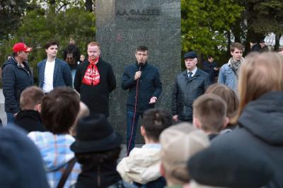После кандидата философских наук выступил и другой педагог, член Бюро МГК ЛКСМ РФ Иван Ильич Гусельников. Его яркое выступление еще больше воодушевило всех собравшихся. Комсомолец и учитель напомнил о месте проведения мероприятия. За собравшимися находятся Александр Фадеев и молодая гвардия. «Они с нами!», — подчеркнул Иван Ильич. Против такой молодёжи, как наши молодогвардейцы-антифашисты, выступал Ильин, который всю жизнь прожил в Германии, а затем в Швейцарии. В это время были убиты многие коммунисты, в том числе Эрнст Тельман. Убиты за борьбу с фашизмом. Комсомолец задал вопрос, о чем же писал Иван Ильин? Он писал о том, что не должно быть равенства, его идеал – сословное общество и хруст французской булки! Тов. Гусельников подчеркнул, что сегодня мы все имеем возможность учиться и получить хоть какую-то социальную поддержку, именно благодаря тем ценностям и принципам, которые коммунисты заложили в страну. «Мы будем бороться со всей фашизацией!», – закончил выступление молодой учитель.