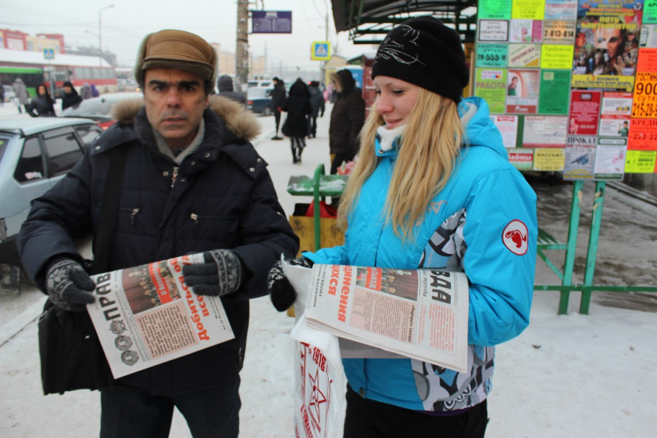 Ребята раздавали газету "Правда", а также проводили полит-информацию о делах в стране, общались с жителями города, приглашали молодых людей вступать в комсомол и в КПРФ. Ну и конечно же не обошлось без людей в серой форме, можно сказать, они нас ждали. Налетели со всех сторон, пользуясь своими служебными полномочиями, забыли даже представиться. Проверили специальный документ - уведомление о том, что мы имеем право находиться на данной территории и проводить мероприятие. Как ни странно, пожелали удачи. Но были сотрудники, которые предупреждали нас о том, что мы не там находимся и пытались запугать нас. Хотя мы, граждане своей страны, соблюдаем Закон и не нарушаем его.