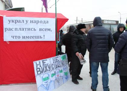 Акция-пикет прошла в районе остановки общественного транспорта "ДК КрасТЭЦ" в Ленинском районе города. Были изготовлены плакаты с надписями "Конфискация имущества и тюрьма - для всех воров и жуликов!", "Украл у народа - расплатись всем, что имеешь!".