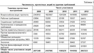 Как и годами ранее, в структуре протестных требований (по числу участников) на первом месте находятся Всероссийские акции протеста (рис.2, табл.1). В них приняло участие 50% всех участников. И в относительных, и в абсолютных показателях это ниже, чем в прошлые годы. Кроме того, можно говорить о продолжающемся серьезном росте протестной активности населения в борьбе с чиновничьим произволом и несогласием с социально-экономическим курсом правительства.