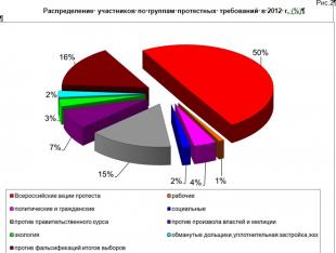 По числу участников после Всероссийских акций протеста лидирующие позиции занимают выступления против правительственного курса и проведенные в начале года акции против фальсификации итогов выборов. Далее следуют акции против произвола властей и правоохранительных органов, посвященные борьбе за жилищные, гражданские и политические права, в защиту окружающей среды и выступления социальной и рабочей тематики (рис.5).