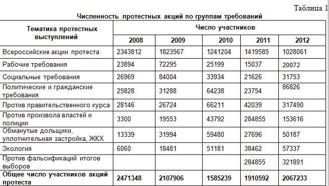 В 2012 году в различного рода протестных мероприятиях приняло участие более 2 млн. человек. Уровень протестной активности хотя и выше уровней предыдущих лет наблюдения, но все же не достиг максимума 2008 года. Как и в прошлые годы, пиковыми периодами объяснимо стали май и ноябрь, на которые на которые приходятся крупнейшие всероссийские акции КПРФ – Всемирный день солидарности трудящихся, празднование дня Победы в Великой Отечественной войне и годовщина Великой Октябрьской Социалистической революции. Кроме того, значительный рост протестной активности, не характерной для прошлых лет, наблюдался в феврале, июне и сентябре и был связан с проведением крупных акций против нечестных выборов, правительственного курса и роста тарифов на услуги ЖКХ.