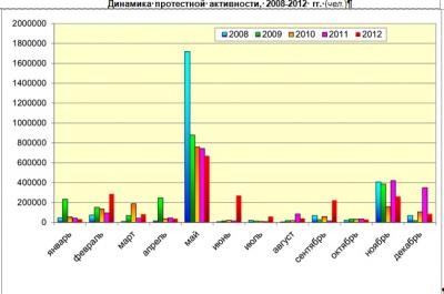 В 2012 году в различного рода протестных мероприятиях приняло участие более 2 млн. человек. Уровень протестной активности хотя и выше уровней предыдущих лет наблюдения, но все же не достиг максимума 2008 года. Как и в прошлые годы, пиковыми периодами объяснимо стали май и ноябрь, на которые на которые приходятся крупнейшие всероссийские акции КПРФ – Всемирный день солидарности трудящихся, празднование дня Победы в Великой Отечественной войне и годовщина Великой Октябрьской Социалистической революции. Кроме того, значительный рост протестной активности, не характерной для прошлых лет, наблюдался в феврале, июне и сентябре и был связан с проведением крупных акций против нечестных выборов, правительственного курса и роста тарифов на услуги ЖКХ.
