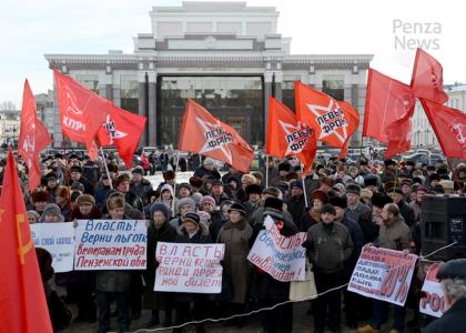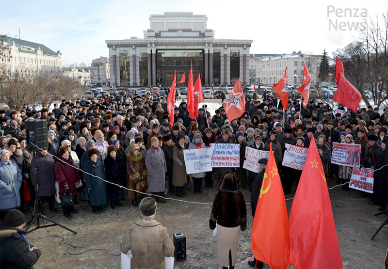 16 февраля, в субботу, на Театральной площади Пензы состоялся митинг против социальной политики властей всех уровней. Акция протеста собрала, по разным данным, от 500 до 700 человек. Организатором выступил Пензенский горком КПРФ. Участие в митинге также приняли областное отделение ЛКСМ, движение «Дети войны», Левый фронт, а также ветеранские организации и трудовые коллективы.