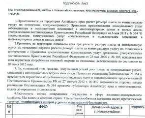 В обращении жители города требуют срочно приостановить на территории края действие Постановления правительства № 354, (в соответствии с которым изменился порядок расчета платы за коммунальные услуги). И предлагается привлечь к ответственности губернатора края, «вплоть до отрешения от должности» — за то, что допустил резкий рост платы за коммунальные услуги и не использовал возможность отсрочки реализации Постановления № 354.