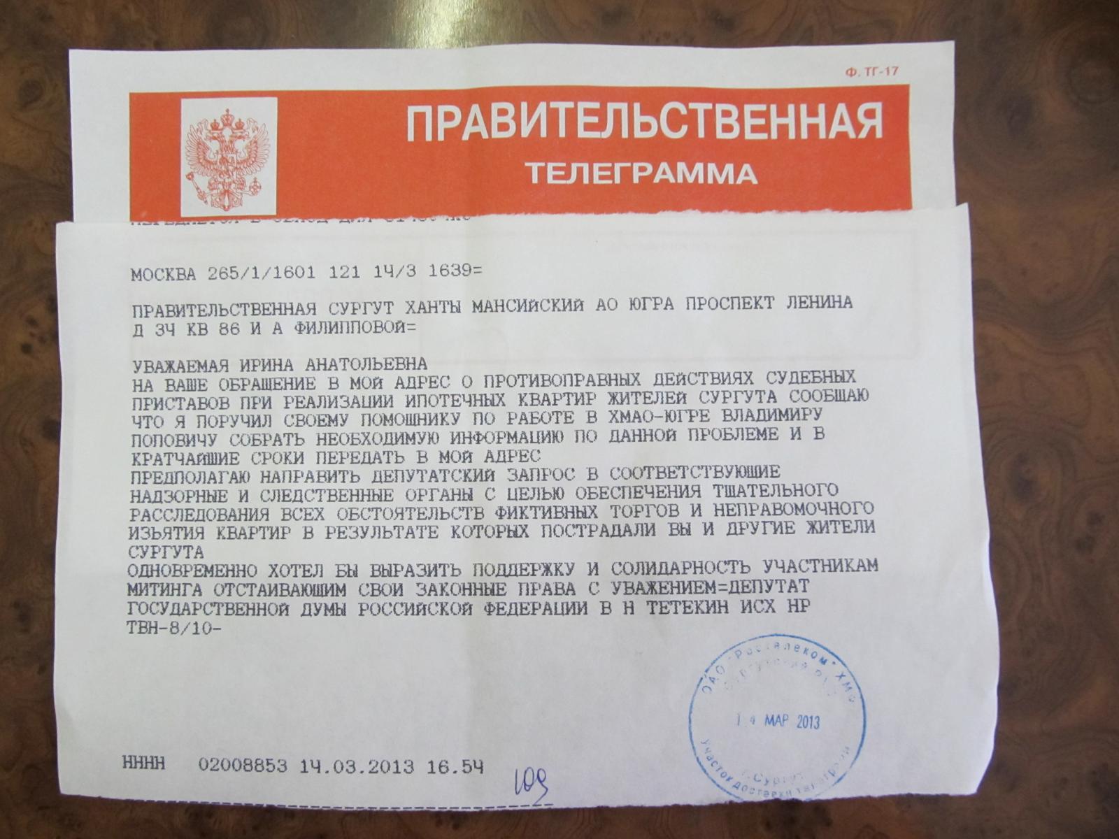 В это связи депутат Государственной Думы РФ В.Н. Тетёкин взял на контроль данную проблему. В направленной участникам митинга правительственной телеграмме он сообщил, что дал поручение своему помощнику на территории ХМАО-Югры собрать всю необходимую информацию по данному вопросу и в кратчайшие сроки передать ему.