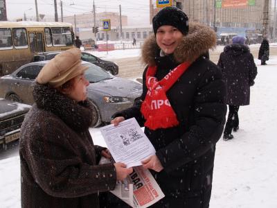 ТУЛА. Несмотря на разыгравшуюся метель, активисты Компартии и ЛКСМ вышли на пикет на оживлённом перекрёстке улиц Ложевая и Марата, что в крупнейшем районе областного центра – Пролетарском. Подошли первый секретарь обкома комсомола, член регионального Молодёжного парламента и депутат Куркинского поселкового Собрания Владимир Исаков, первые секретари Пролетарского и Зареченского райкомов КПРФ Владимир Соколов и Виктор Ерёмин, молодые депутаты-коммунисты местных Собраний Дмитрий Дубовенко (он ещё и член Молодёжного парламента) и Наталья Тараскина, ветеран партии Александра Васильевна Крисаленко, лидер комсомольцев-пролетарцев Руслан Алиев, другие товарищи.