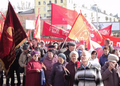 Праздничное шествие началось с площади Октября, откуда под звуки «Интернационала», по центральной алее проспекта Ленина, колонна демонстрантов выдвинулась в сторону площади Советов. На первомайскую акцию коммунисты вышли с лозунгами: «Россия. Труд. Народовластие. Социализм», «Коммунисты за бесплатное образование!», «Оплата заслуги ЖКХ – не выше 10% от дохода семьи!», «Да здравствует 1 мая!», «Сталин! КПРФ! Победа!», «Требуем отменить постановление №354!». Демонстранты, среди которых, на удивление, как и во времена первомаев в СССР, было много семейных пар с детьми, под аккомпанемент советских песен шли с флажками: «Я люблю СССР!». В 9-20 на центральной площади города начался митинг, в котором приняло участие более 700 человек.