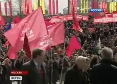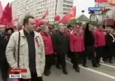 Телеканал "Россия" в вечерней программе "Вести" показал сбойку о первомайских шествиях в Москве. Отмечая массовость шествия КПРФ ведущий программы отметил, что с Кулужской площади колонна КПРФ вышла в пятитысячном составе, а до памятника Марксу коммунисты уже дощли 15-тысячной колонной.