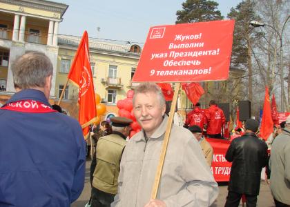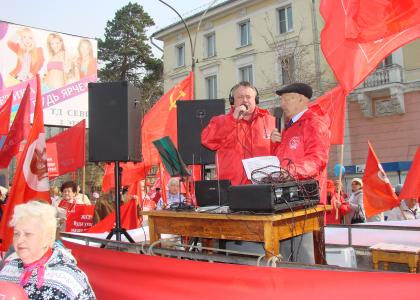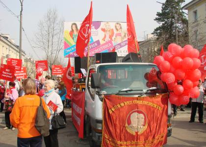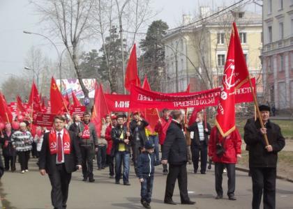 Две же колонны носили абсолютно протестный характер. Колонна городской организации КПРФ, в которой присутствовал и первый секретарь Иркутского обкома КПРФ Сергей Левченко, расположенная в голове демонстрации шла предпоследней. Коммунисты, организовав звуковое сопровождение, пропустили мимо себя колонны всех предприятий и учреждений, приветствую и поздравляя их. Через площадь им. В.И. Ленина колонна КПРФ прошла мощно и убедительно не по сценарию администрации, а по своему собственному.