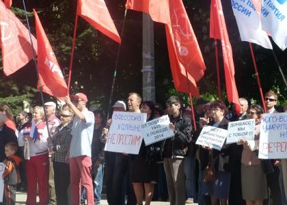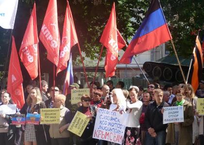 Коммунисты Крыма и представители различных общественных организаций вышли с флагами и плакатами «Юго-восток, Крым с тобой!», «Фашизм не пройдет!», «Оранжево-коричневых палачей к ответу», «Юго-восток, вперед!» к зданию Государственного совета Республики Крым.