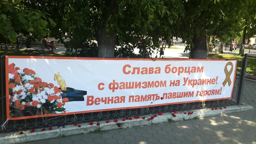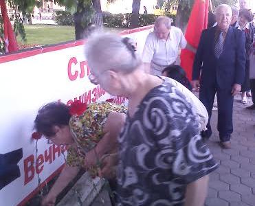 Кульминацией акции КПРФ стало восстановление растяжки со словами солидарности с украинскими братьями и скорби по жертвам фашизма, а также возложение к ней красных гвоздик.