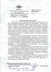 Более того, администрация Сочи подключила сюда и высокие полицейские чины. Вслед за Мажановой, зам. нач. полиции УВД по г. Сочи Огурцов напоминает организаторам митинга «о недопустимости осуществления пропаганды экстремистской и террористической деятельности» и призывает «к соблюдению установленных законодательством Российской Федерации требований по проведению массовых мероприятий», при этом не забыв упомянуть об «ответственности в установленном порядке». (Курсивом в кавычках приведены цитаты из ответов наших «господ»).
