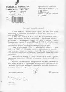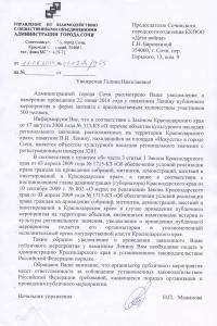 Причину для отказа в согласовании уведомления в администрации нашли совершенно смехотворную, равно как и неуклюжую и нелепую. В ответе, который подписан нач. управления горадминистрации Мажановой Натальей Павловной, площадь у памятника Ленину объявлена принадлежащей краю, а посему, мол, необходимо получать согласование не в администрации Сочи, а в краевой администрации!