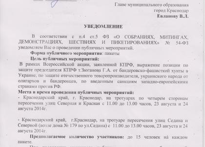 По всей стране местные и региональные комитеты партии подали соответствующие уведомления о массовых акциях. В Москве 23 августа разрешен митинг КПРФ прямо у Кремля, на площади Революции. Уведомление о проведение протестных мероприятий было отправлено согласно требованию Закона РФ и в администрацию г. Краснодара…