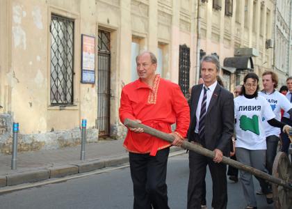 Акция завершилась инсценированным отнятием «премии мира» у куклы «Обамы», которого переехала телега.