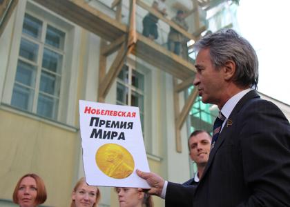 9 сентября у Представительства ООН в России состоялся театрализованный митинг КПРФ с требованием лишить президента США Барака Обаму Нобелевской Премии Мира.