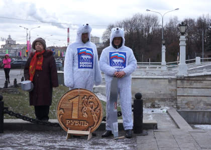 В это время два молодых человека в костюмах белых медведей с символикой «Единой России» стали старательно пилить деревянный макет российского рубля. «Рубль» вначале не поддавался, широкими зубьями двуручной пилы никак не удавалось сделать надпил. В этот момент подумалось, что современные персонажи из российского правительства очень напоминают известных литературных героев «Золотого теленка». Такие же жуликоватые и авантюрные. Если слегка перефразировать знаменитую фразу, получится: «Пилите, Дима, пилите…».