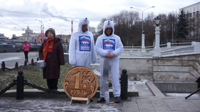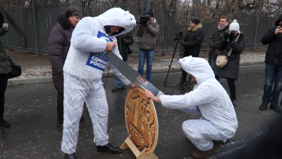 В это время два молодых человека в костюмах белых медведей с символикой «Единой России» стали старательно пилить деревянный макет российского рубля. «Рубль» вначале не поддавался, широкими зубьями двуручной пилы никак не удавалось сделать надпил. В этот момент подумалось, что современные персонажи из российского правительства очень напоминают известных литературных героев «Золотого теленка». Такие же жуликоватые и авантюрные. Если слегка перефразировать знаменитую фразу, получится: «Пилите, Дима, пилите…».
