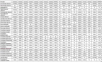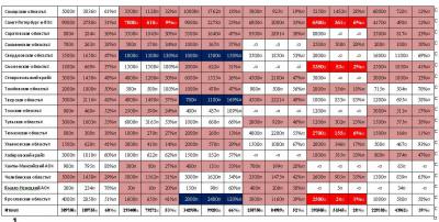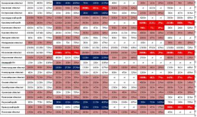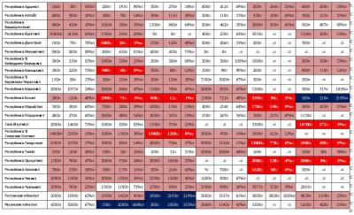 - от 3-х до 5-ти кратного: Алтайский край, Архангельская область, Калининградская область, Московская область, Новгородская область, Новосибирская область, Омская область, Орловская область, Республика Калмыкия, Республика Марий Эл, Республика Мордовия, Республика Саха (Якутия), Республика Удмуртия, Республика Чувашия, Самарская область, Санкт-Петербург и ЛО, Саратовская область, Сахалинская область, Томская область, Тюменская область, Ульяновская область;